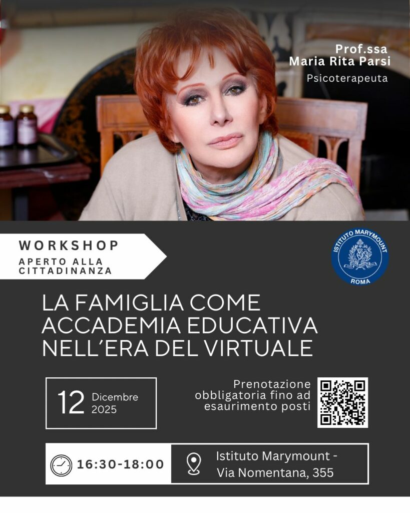 In quest’ottica, venerdì 12 dicembre 2025, dalle 16.30 alle 18.00, presso la sede di via Nomentana 355, ospiteremo la Prof.ssa Maria Rita Parsi, psicoterapeuta, scrittrice e presidente di Fabbrica della Pace e Movimento Bambino Onlus, per un incontro dal titolo “La famiglia come Accademia educativa nell’era del virtuale”.